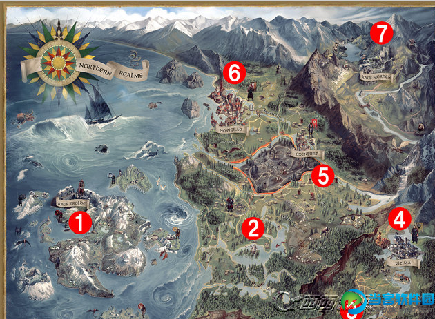 巫师3中的地图是非常庞大的,面对如此庞大的地图系统许多玩家不知道该怎么下手,今天小编就为大家详细的介绍一下巫师3中地图七大区域,了解了各个区域,各位玩家就可以踏上冒险的征程了。 冒险的舞台 广大的世界为了寻找名为“ciri”的女性,主人公杰洛特踏上寻徒之旅,在旅途中造访世界各地,下图为世界地图,这里介绍下世界的重要据点。