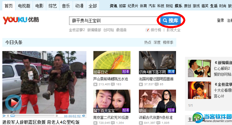 比如,现在我们想下载《薛平贵与王宝钏》,可以访问 优酷网首页,输入“薛平贵与王宝钏”,然后点击“搜库”按钮: