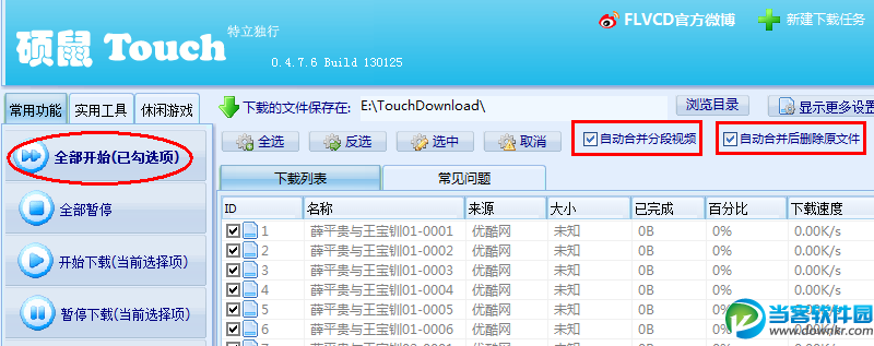 在Touch下载器中设定好视频存储路径后,点“全部开始(已勾选项)”就开始批量下载整部电视剧了。