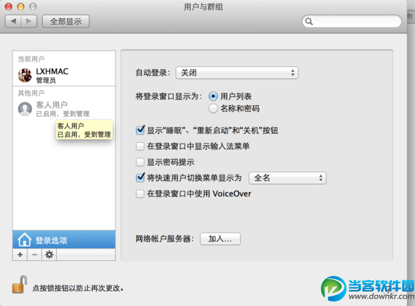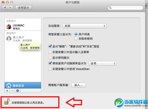 第三步:点左下角的锁,输自己的密码解开 点客人用户,勾选项去掉。