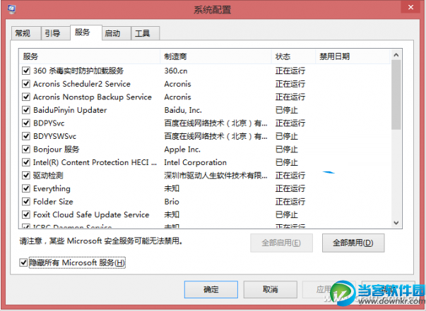 通过Win+R运行MSCONFIG,切换到“服务”选项卡,选择“隐藏所有Microsoft系统服务”,然后逐一禁用所有外来服务,禁用所有启动项,看问题是否得到解决
