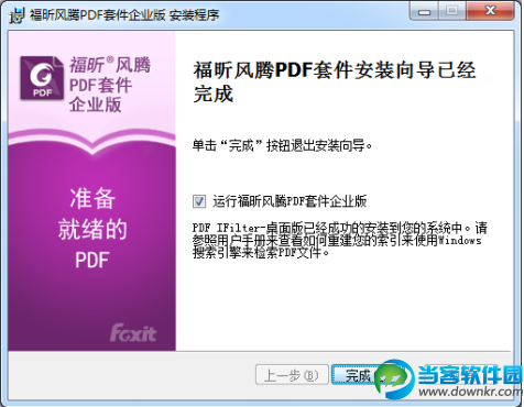 5. 完成安装后,系统将弹出一个信息框显示福昕风腾 PDF 套件已安装,可点击“运行福昕风腾 PDF 套件企业版”选项立刻启动该程序。然后点击“完成”,结束安装。