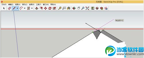 6、通过‘直线’工具,沿着两条屋檐绘制如下图所示相交的两条射线。