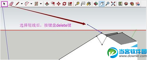 7、绘制完成后,通过‘选择’工具选择没用的短线后delete键删除,绘制出屋顶的角。