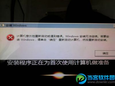 快安装完系统时遇到提示:计算机意外地重新启动或遇到错误。Windows 安装无法继续。若要安装Windows,请单击“确定”重新启动计算机,然后重新启动安装”。如下图所示: