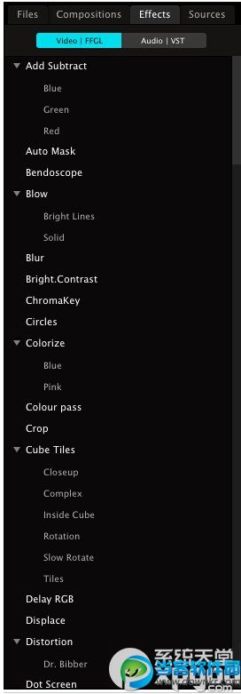 栏标下有个列表,上面载有Resolume提供的特效。音频VST按钮则用作打开音频特效。