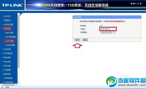 网络参数口▶LAN口设置▶IP地址▶172.168.1.1▶保存