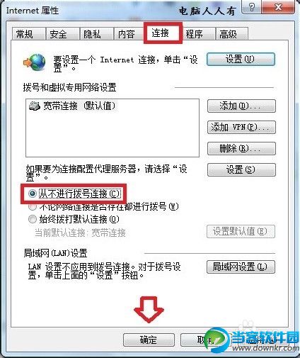 开始▶控制面板▶Internet 选项▶连接▶从不进行拨号连接▶确定。