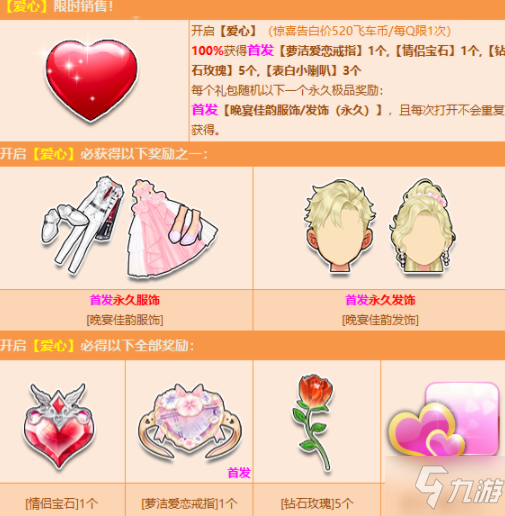 5月20日-6月27日,爱心限时发售!2021 告白节专属福利:【爱心】,惊喜告白价:520飞车币(限购1次)。打开后100%获得情侣宝石*1、首发萝洁爱恋戒指*1、钻石玫瑰*5等!每个礼包随机一个以下永久极品奖励:首发永久专属【晚宴佳韵服饰/发饰】。发饰/服饰全部拥有前不会重复获得。