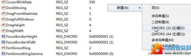 第二步、依次展开注册表项“HKEY_CURRENT_USER\Control Panel\Desktop”,在右侧窗口空白处单击右键,新建一个“DWord 32位值”。
