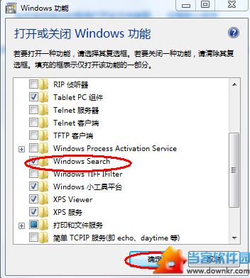 第二步、在随后打开的对话框中,找到并勾选“Windows Serach”,在最后会弹出一个对话框,然后确定,等上4.5分钟就行了。然后你点开始就能看到搜索框了。