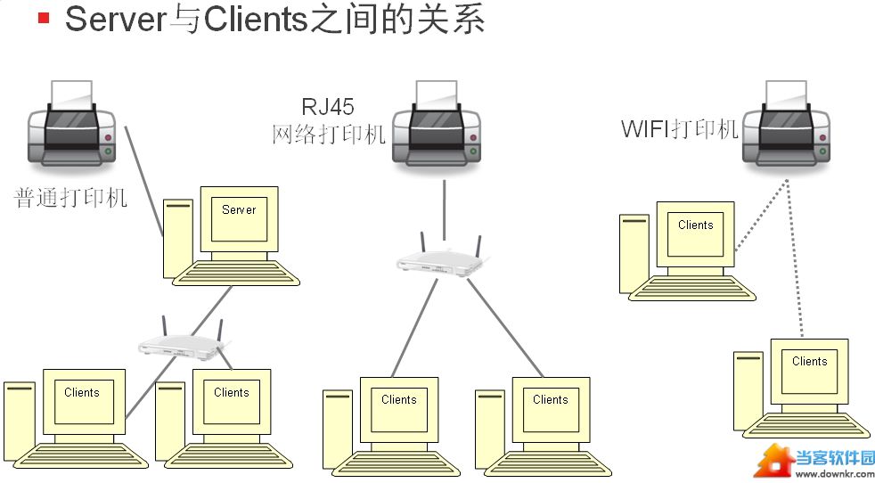 附知识点分析: 打印机类型 打印方式:喷墨、针式、激光 接口种类:LPT、COM、USB、RJ45、WIFI 共享角度:计算机to计算机、打印机to计算机 打印机共享理念(拓扑图)
