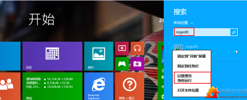 这里需要用到注册表,我们打开搜索,输入 regedit 然后,右击用“管理员权限”打开!