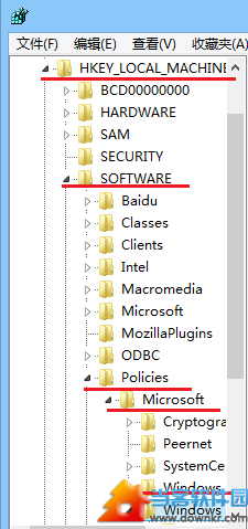 找到如下路径:HKEY_LOCAL_MACHINE | SOFTWARE | Policies | Microsoft | Windows。
