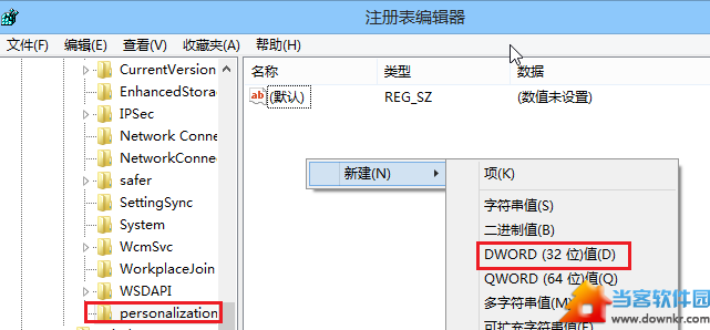 在Personalization项下面,新建一个DWORD (32位)值,名为:NoLockScreen。
