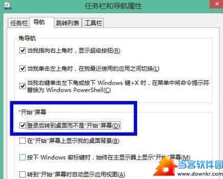 进入系统后直接进入桌面而非Metro界面的方法就是,右击任务栏选“属性”,找到“导航”,勾选“登陆后转到桌面而不是‘开始’屏幕”这一项即可!