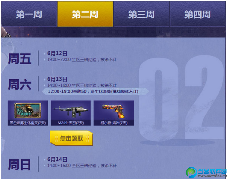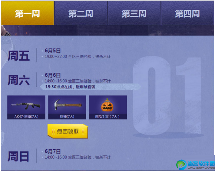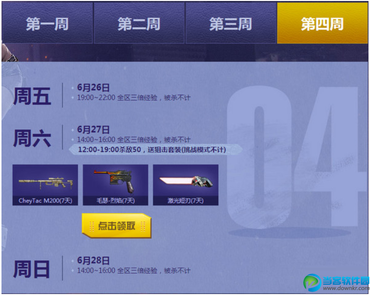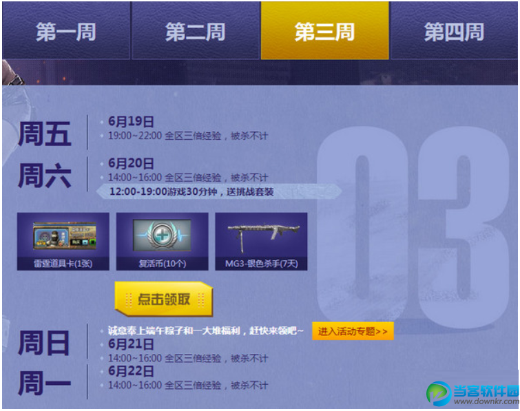 揾昀栀末痛快玩6月活动正式开始啦!此次活动将持续到2015年6月28日,每周三倍经验爽翻天,更有极品武器等你来拿!在这个炎炎夏日每个周末你都将通过玩穿越火线获得不同的惊喜!下面为大家带来cf周末痛快玩6月活动网址及每周奖励一览,大家千万不要错过哦! 活动时间:6月5日——6月28日 活动地址:点击进入 第一周 第二周 第三周 第四周 活动规则 在大厅和房间内挂房,中途退出游戏不计入游戏时长,中途加入可以计入; 参加准点在线后,玩家可以在次日领取奖励; 每个QQ号活动期间只有1次领奖机会; |