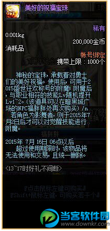 ★ 2015年6月18日至7月30日通关推荐等级地下城会掉落【7周年宝葫芦】。 称号介绍 打开【2015盛世狂欢称号礼盒】可以获得【2015盛世狂欢】称号,6月18日至7月16日,福胖胖处会以20w金币的价格出售【美好的祝福宝珠】, 勇士也可以用15个【7周年宝葫芦】在福胖胖处兑换【美好的祝福宝珠】。 活动规则 该活动在6月20下午13:00-17:00进行; 在每次发放奖励时在线的玩家将会获得该阶段奖励; 只有参加该活动的角色可以获得奖励,点击领奖后,将通过游戏内邮件发送奖励; 【2015盛世狂欢称号礼盒】、【美好的祝福宝珠】、【2015盛世狂欢宠物礼盒】、【欢乐代币券】以及【7周年宝葫芦】 影舞者角色要在7月2日凌晨6:00后才能使用【美好的祝福宝珠】附魔【2015盛世狂欢】称号。 |