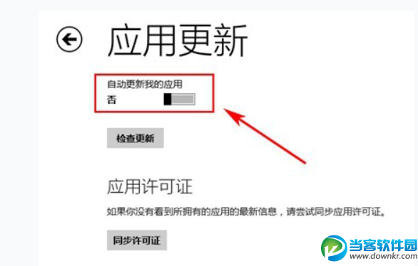 4.在“应用更新”界面中,使用鼠标或手指,将“自动更新我的应用”按钮滑动到左侧显示为“否”,这样,即可将Win8应用自动更新功能给关闭掉了。