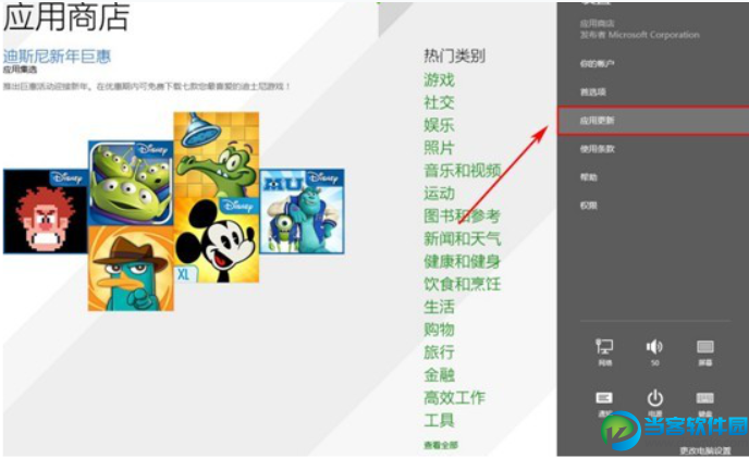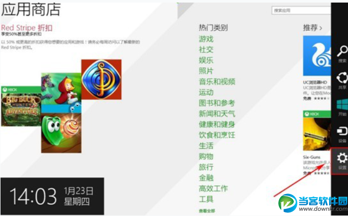 2.接着,进入到应用商店,将鼠标移动到屏幕右上角或右下角处,触屏用户用手指从右侧屏幕向左侧滑动,调出超级按钮边框,然后,点击“设置”按钮。