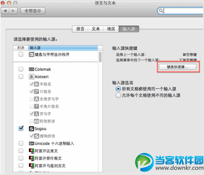 三、在打开的"语言与文本对话框中,选择输入源选项卡,点击右侧的键盘快捷键设置。