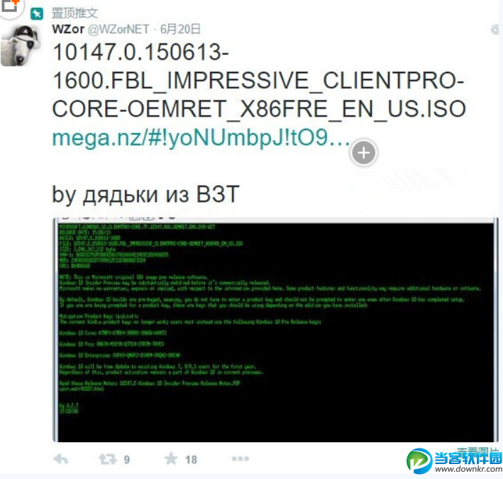 6月22日消息,继64位Win10预览版10147镜像泄漏后,俄罗斯WZor又在其Twitter上公布了32位版Win10预览版10147英文镜像和语言包下载泄露的消息。下面就一起来详细情况及下载地址吧,希望会对大家有所帮助的 很多朋友可能会说32位已经过时了,而实际上大多数平板设备安装的就是32位Windows,因此32位还是很有必要的。想在平板上尝试最新版本的朋友可能会需要这个。本文同时提供国内和国外网盘两种下载途径。 Win10预览版10147 32位英文镜像: 国内网盘 || 国外网盘 文件为rar压缩文件,解压后可得到ISO镜像。ISO镜像文件信息: 版本: 10147.0.150613-1600 文件: 10147.0.150613-1600.FBL_IMPRESSIVE_CLIENTPRO-CORE-OEMRET_X86FRE_EN_US.ISO 大小: 3,046,367,232 byte SHA-1: 86DD1D75055BE828637616664114C821E8436035 MD5: 29FA1D930207799912F1103B6ADC3CD4 CRC: B64BA16B Win10预览版10147 32位语言包镜像: 简体中文语言包:国内网盘 || 国外网盘 台湾繁体语言包:国内网盘 || 国外网盘 |