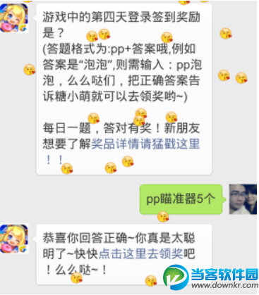 题目:游戏中的第四天登陆签到奖励是(答题格式为:pp+答案哦,例如答案是”泡泡”,则输入:pp泡泡,么么哒们,把正确答案告诉糖小萌就可以去领奖哟~)