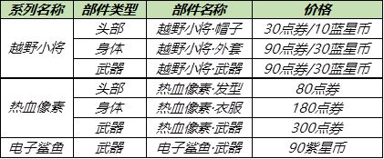 其中前两套包含头部、身体和武器,可以通过点券或者蓝星币购买;而电子鲨鱼则只有武器,并且只能通过紫星币来获取。