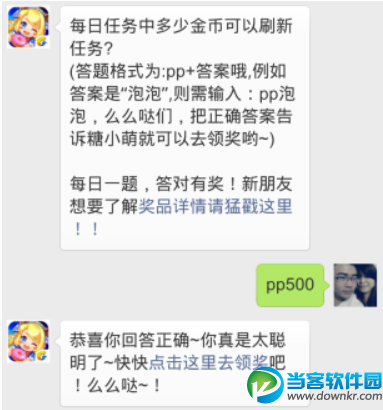 题目:每日任务中多少金币可以刷新任务(答题格式为:pp+答案哦,例如答案是”泡泡”,则输入:pp泡泡,么么哒们,把正确答案告诉糖小萌就可以去领奖哟~)