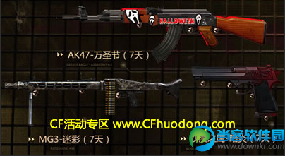 7月10日-7月25日的CF精英军火库活动,可领取AK47-万圣节(7天)+MG3-迷彩(7天)+沙漠之鹰暗炎(7天)。 7月CF精英军火库活动网址http://cf.qq.com/act/a20141030bchd/ 小编去领取时提示“非常抱歉,您还不满足参加该活动的条件!”。具体要什么条件呢,也没说。 |