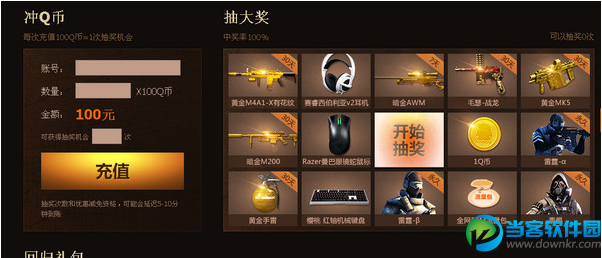 购买苍雷抽奖 回归礼包 回归老兵可直接领取一份回归礼包 活动时间:7月17日-7月28日 活动规则 1预售活动时间:7月17日——7月28日,在此期间无法在游戏内直接购买M240B-苍雷 2通过本活动页面充值Q币,单笔充值满100Q币购买M240B-苍雷减5元,单笔满200减10元,最高累计可减免10元(注意:累计充值100不可以参加减免活动) 3预售购买的M240B-苍雷,将在大区版本更新之后2个工作日内发送到游戏仓库中,请耐心等候;预售赠送的豪华礼包道具,在购买24小时内发送到游戏仓库中 4通过本活动页面充值Q币,可以参加抽奖活动,100Q币抽1次,100%中奖 (由于数据量较大,通过本活动页面充值的Q币确认到账后,才可以获得抽奖机会,请先确认Q币是否到账!参与人数过多时或存在5-10分钟延迟,请耐心等候) 5战队贡献值将在预售结束后,服务器维护时计入 6购买道具后可选择礼包,如活动结束时仍未选择礼包,该机会将作废 活动地址:点击进入 |
