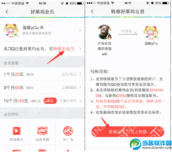 今天突然发现qq好莱坞会员总算有良心了一次,好莱坞会员还能转到微信账号,废话不多说,下面是qq好莱坞会员转微信账号方法。 1、首先在腾讯视频客户端上找到个人中心,使用微信登录,点击开通好莱坞会员; 2、在开通好莱坞会员上方我们可以看到提醒,如果QQ已是好莱坞会员可以转移至微信,点击后,选择QQ账号,转移须知大家必须得看清楚,别到时候说QQ为什么享受不到好莱坞会员,如果没意见的话,确认转移。 如果大家想了解更多软件教程最新资讯,请持续关注本站,本站小编将在第一时间为大家带来最好看、最有趣、最新鲜的软教资讯。更多精彩内容,尽在当客下载站。 |