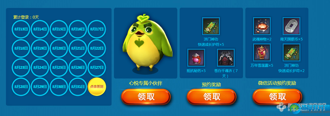 领取规则: 1、预约时间8月6日-8月12日,所有心悦用户可在页面进行预约,成功预约的用户可在8月13日-9月10日期间,领取预约奖励。 2、心悦剑灵用户累计7天登录游戏并在页面进行签到即可领取心悦专属伙伴。每个QQ仅可领取一次。 3、参与微信预约活动的用户可在8月13日-9月10日期间,在页面领取微信预约奖励,仅可领取一次。 规则说明: 活动时间:8月13日-8月31日 1、所有剑灵用户每日登录游戏即可参与一次抽奖,心悦用户可额外获得一次抽奖机会,幸运用户登录游戏后也可以额外获得一次抽奖机会。 2、每日抽奖次数仅当日有效,隔日重新计算。 |