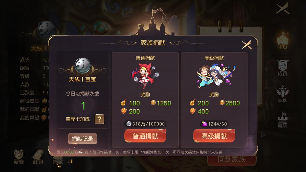一个家族的实力是否强大, 玩家们能够直接从家族声望当中进行观察。那么针对有杀气童话2家族声望如何提高的问题,在下文的内容分享当中,小编将会详细的为大家分享一下,如何快速的解决此类问题。 第一种提升家族声望的方法就是进行捐赠。玩家们进入到家族的主页面之后,就可以看到捐献的选项。目前玩家们可以通过普通和高级捐献来为所在家族提高声望。普通捐献会消耗铜币,高级捐献主要消耗钻石。 第二种方式是积极的参加家族活动。这些活动包括了家族强盗、家族跑商、家族任务、家族试炼等。玩家们只要每日都花费一定的时间去完成这些活动,久而久之就会提高家族的声望。 第三种方式非常的简单,那就是玩家们参与每天的家族聚会。在家族聚会当中,玩家们只要参加就会提升一定的家族声望。并且在参加的同时,还可以获得高级的宝箱以及家族贡献度。 总之,玩家们将以上内容当中提到的三种方式结合起来使用,就可以快速增加所在家族的声望,家族的声望越高,为玩家们带来的家族福利就会越丰富,希望大家合理的运用起来。 关于有杀气童话2家族声望如何提高的问题,针对该问题的内容分享,就讲到这里。 |