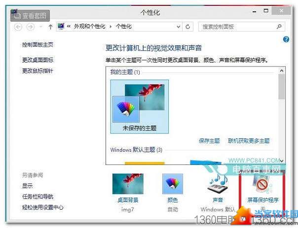 首先在Win8.1桌面上右键,然后选择“个性化” 在打开的个性化设置底部中,点击“屏幕保护程序”设置,如下图所示: