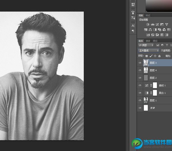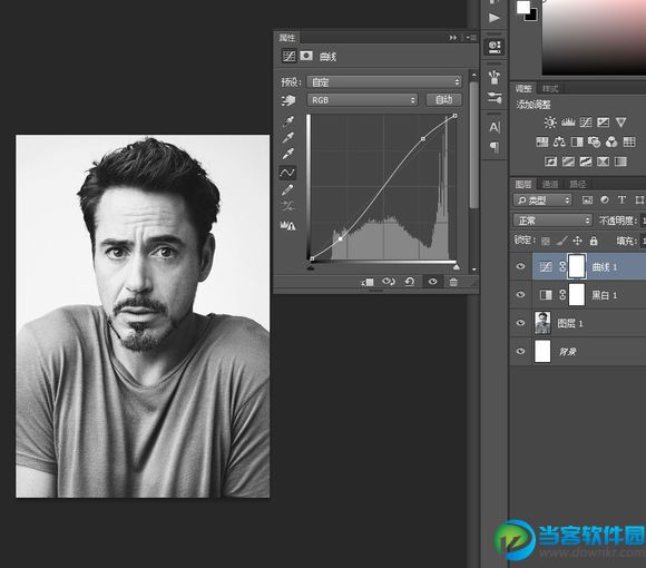 这张貌似黑白的图片还是带有一些色相,添加一个黑白调整层,你也可以直接去色,顺便添加一个曲线加强对比度,我主要的目的是让背景更接近纯白色。