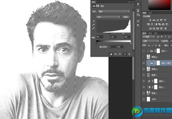 给这个两个盖印层各自添加一个色阶调整层,并且剪切蒙版各自的盖印层。首先调整横向波纹的色阶,保持黑白条纹的粗细相同。