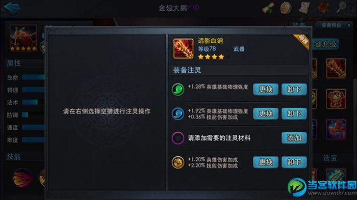 玩家可以点击装备的注灵按钮,即可弹出装备注灵的操作画面。然后只需要点击开孔,便可以在相应的孔位处添加注灵宝石。不同品质的宝石需要配合相应品质的装备,以上图为例,只有金色的武器才能注灵金色宝石,同时也可以注灵更低品质的宝石。