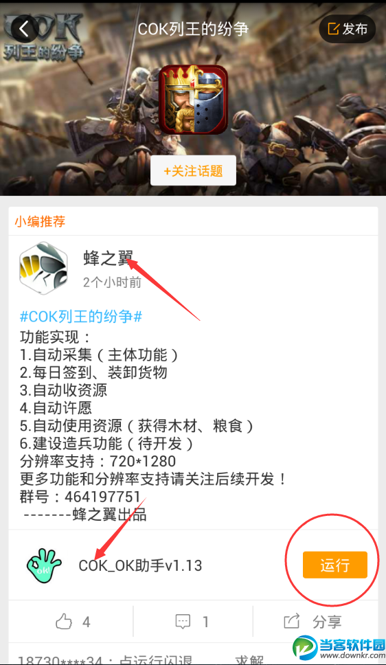 进入列王的纷争专区后,选择蜂之翼这个作者的OK助手,点击运行