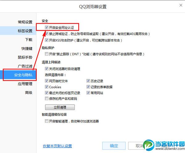 3、进入“安全与隐私”——开启安全网址认证——点击确定