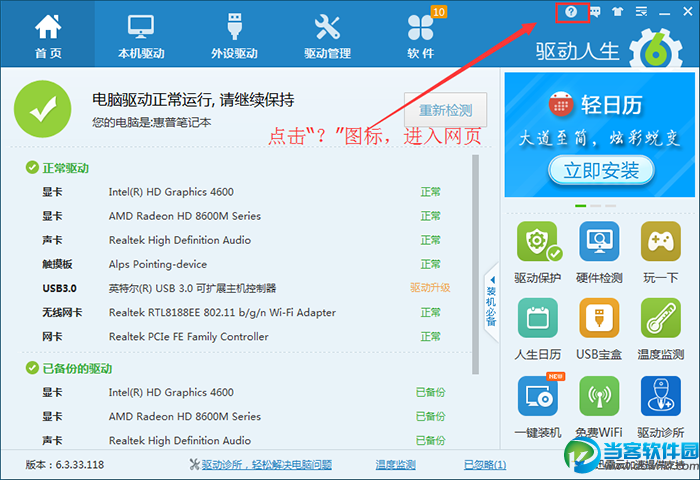 首先,搜索下载最新版的驱动人生6,完成安装后,打开软件界面,会有一个“开始检测”按钮,建议可以点击检测下电脑驱动是否有异常情况。检测完如有异常,只要根据提示进行操作即可。点击右上角的“?”图标,即可查看软件上诸多功能的操作方法。