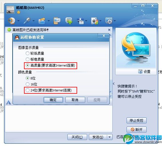 3、如果您觉得远程显示的效果太差的话,您可以要您的好友点击右边的设置按钮,这时候会弹出一个设置窗口,要您的好友在图像显示质量选项中选择“高质量”颜色质量选择24位。如下图,这样远程显示的效果就好多了,不过此操作需要您和您的好友的网速够快噢!