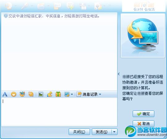 2、当您的好友接受了您的远程协助邀请后,您的右侧窗口会提示您是否让您的好友看到您的屏幕,您点击确定即可。如下图