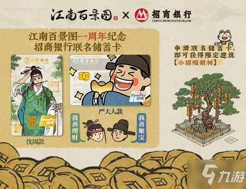 联名卡面有两款——严大人•我善聚宝、沈周•我善理财。让他们的“专属技能”陪伴知府们畅行于理财之路吧!申请联名储蓄卡还可在卡面激活后获取限定建筑【小招喵财树】。