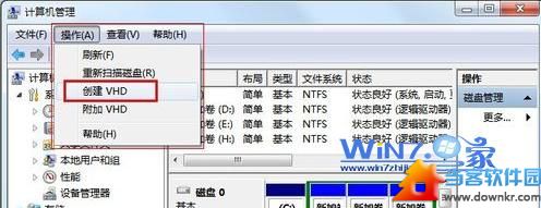 3.在“磁盘管理”项单击右键,选择“创建VHD”,按提示进行操作。