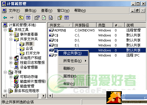 第二种方法:依次打开我的电脑右键-->管理-->共享文件夹-->共享,右侧列表列出的就是你现在的共享的内容,不管是用户共享或默认共享,都可以通过右键的方式停止共享,如下图所示: