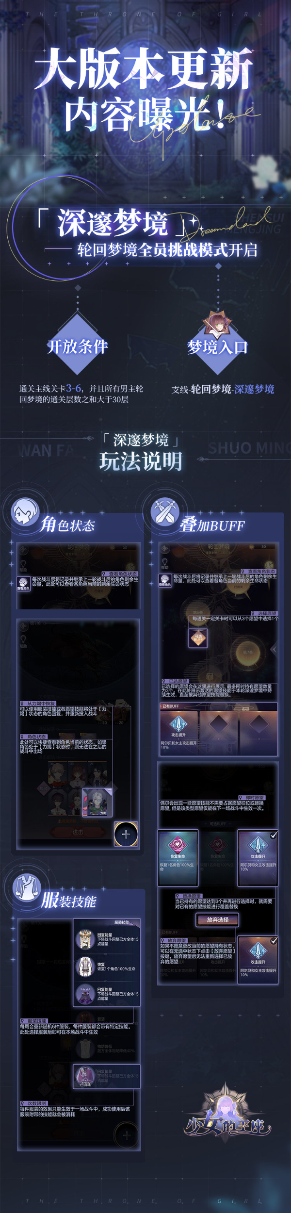 【更新时间】 2021年7月13日 6:00 – 12:00,总计6小时。如遇任何问题,开服时间将顺延。 【更新方式】 1.本次为停服换包更新,更新期间将无法进入游戏。更新完毕后,需下载最新版本方可正常进行游戏。 2.进入旧版本游戏时会出现更新弹窗,点击确认即可跳转至新版本下载地址。另外,公主殿下也可自行前往官网或各应用商店下载新版本。请注意,未进行更新将无法正常进行游戏。 【更新奖励】 1.更新版本奖励:可在邮件中领取【魔能石*10】的奖励,邮件有效期为1个月,在维护结束前注册的玩家均可领取。 2.维护奖励:可在邮件中领取【幻水晶*600+体力180】的奖励,邮件有效期为7天,在维护结束前注册的玩家均可领取。 【更新内容】 一、新玩法:深邃梦境 1. 开启条件:通关主线3-6,且所有男主轮回梦境的通关层数之和达到30层。 2. 玩法入口:支线-轮回梦境-公主头像 二、新系统:记忆之力 1. 开启条件:通关主线4-13 2. 系统入口:角色-记忆之力 三、新系统:命运 1.开启条件:通关主线M1-1开启命运系统,随角色初遇节点开放对应角色的命运系统。 2.系统入口:羁绊-角色-命运 四、新功能:活跃度宝箱 新增每日活跃奖励,完成日常任务后会对应增加活跃度,达成每档活跃值可获得对应的宝箱奖励。 五、新背景:雪景花房 新增游戏背景【雪景花房】,花费450幻水晶即可解锁。 |