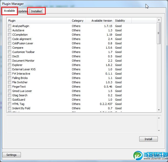 点击:Plugins -> Plugin Manager -> Show Plugin Manager-> Avaliable一栏显示当前可用的插件列表,选中你要的插件,然后点击下面的Install即可自动下载和安装对应插件,很是方便。