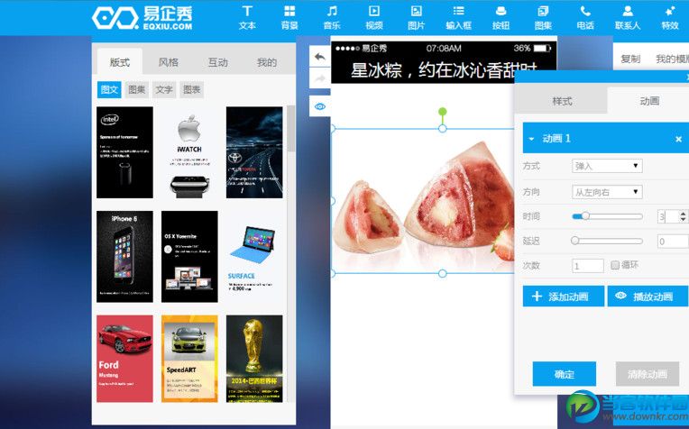 调整好图片的大小及位置,选中图片后点击右键,选择动画,添加一个动画效果:方式-弹入,方向-从左到右,时间选择2秒。这意味着这张图片会在2秒的时间里从左至右弹入页面。建议在选择时间时考虑到背景音乐的节奏。