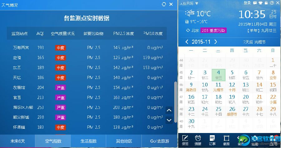 人生日历甚至还能看当前城市各个监测点的实时数据。要早起上班的小伙伴更需要用人生日历来查看空气指数了,如同样被雾霾深深伤害的北京,各个监测点的指数情况不一样,如果你上班的区域是严重污染的,那可就要戴口罩出门了。